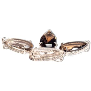 Origem: Montagem em Curvelo, MG (Brasil) Variabilidade Natural: Por ser uma pedra natural, o quartzo fumê pode apresentar variações em suas tonalidades e inclusões naturais, o que torna cada peça única. Cuidados com a Pedra: Recomenda-se hidratar com óleo mineral para preservar o brilho e a integridade do quartzo fumê. Zircônia: Embora sintética, a zircônia é projetada para imitar o brilho do diamante, adicionando um toque de luxo ao design sem comprometer a autenticidade da pedra natural.