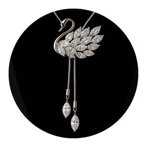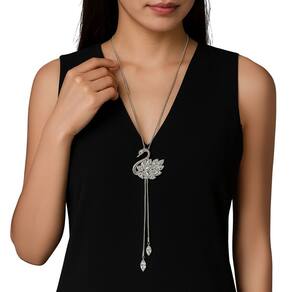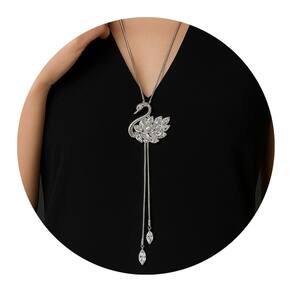 Colar Longo Cisne Prata com Cristais Brilhantes é um acessório de luxo que une delicadeza e glamour. Seu pingente em formato de cisne é ricamente adornado com cristais lapidados que refletem a luz com intensidade, criando um brilho sofisticado. O design alongado com duas folhas cravejadas suspensas acrescenta leveza e movimento à peça, tornando-a perfeita para eventos formais, jantares e ocasiões especiais. Ideal para combinar com vestidos ou blusas lisas, garantindo um visual elegante e marcante.