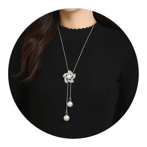 Colar Longo Flor Pérola Festa Elegante é o acessório ideal para compor produções sofisticadas. Seu pingente em formato de flor cravejada de micro zircônias, com pérola central e duas pérolas pendentes, traz um toque de luxo e feminilidade. Perfeito para festas, casamentos e eventos formais, harmoniza com vestidos de tons neutros ou escuros, valorizando o decote e alongando a silhueta. Uma escolha charmosa para quem deseja brilho e delicadeza em um só acessório.