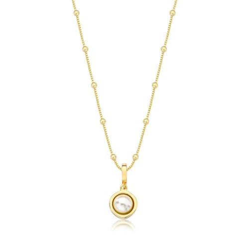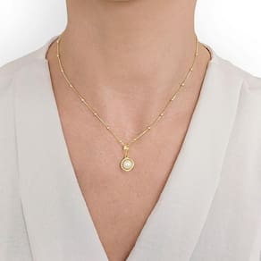 Este colar foi elaborado com um lindo pingente simbolizando a macadâmia com uma pérola e esmaltação no verso, representando toda a beleza das macadâmias, junto à uma corrente veneziana com pequenas esferas e Revestimento em Ouro.