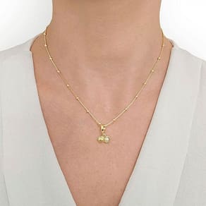 Este colar foi elaborado com um lindo pingente removível que representa a beleza das macadâmias, junto à uma corrente veneziana com esferas, revestida em Ouro. Uma peça única e delicada, capaz de representar toda riqueza desse fruto.