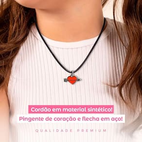 2. Pingente de Coração Cupido - O pingente em formato de coração cupido, na cor vermelha, traz uma flecha atravessando o coração, feito em metal para garantir durabilidade e um toque de charme, perfeito para uso diário.