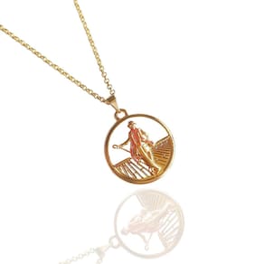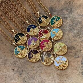 Colar com pingente Orixá Zé Pelintra. Detalhes alto relevo fundo em resina branca Diâmetro total: 26mm Corrente: 60 cm Material: zamac dourado com camadas de verniz italiano de 3 meses no banho e cravação das pedras mediante a defeitos de fabricação e não mau uso pelo cliente Caso aconteça um desgaste do banho, mudança de coloração, a peça será submetida a teste para averiguar se foi problema de fabricação ou mau uso. Marca: Le Rouge Joias