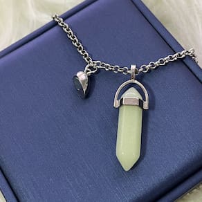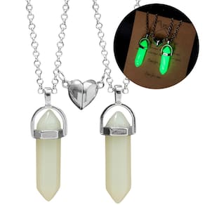 Quando usar o colar em ambiente escuro, os pingentes brilham com uma cor verde vibrante, criando um efeito místico e chamativo. Este colar pode simbolizar conexão ou cumplicidade, ideal para casais ou amigos, com um estilo moderno e elegante, com um toque especial de brilho noturno.
