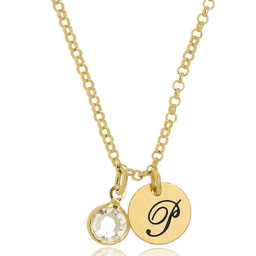 Um lindo modelo de colar personalizado de chapa redonda com inicial e um pingente de zircônia, com certeza um verdadeiro charme e encanto.