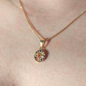 As zircônias coloridas estrategicamente posicionadas ao redor do pingente trazem um brilho incomparável, iluminando seu dia com suas tonalidades vibrantes e encantadoras.