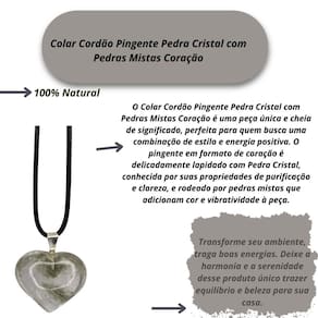 O Colar Cordão Pingente Pedra Cristal com Pedras Mistas Coração é uma peça única e cheia de significado, perfeita para quem busca uma combinação de estilo e energia positiva. O pingente em formato de coração é delicadamente lapidado com Pedra Cristal, conhecida por suas propriedades de purificação e clareza, e rodeado por pedras mistas que adicionam cor e vibratividade à peça. Este colar é ideal para aqueles que querem incorporar energia curativa e proteção em seu dia a dia, ao mesmo tempo em que adicionam um toque sofisticado e romântico ao seu visual. O cristal, além de ser visualmente encantador, também ajuda a harmonizar o ambiente e promover bem-estar, enquanto as pedras mistas ao redor potencializam suas propriedades. Benefícios: