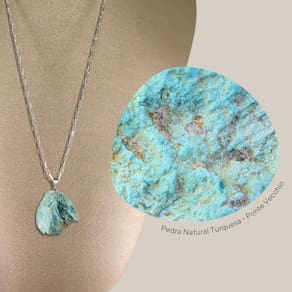 A Turquesa, com seu azul vibrante e veios naturais, é valorizada por suas propriedades de cura e equilíbrio. Esta pedra antiga promove bem-estar e harmonia, destacando-se em qualquer joia.
