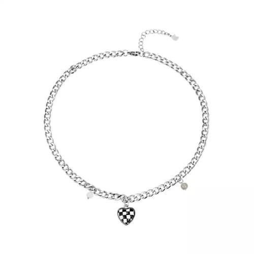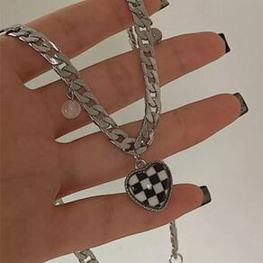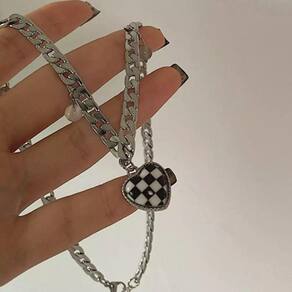 Colar prateado corrente coração xadrez branco preto