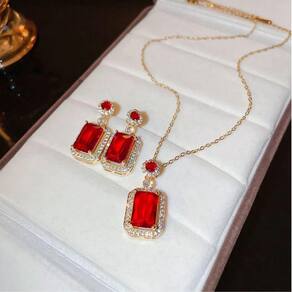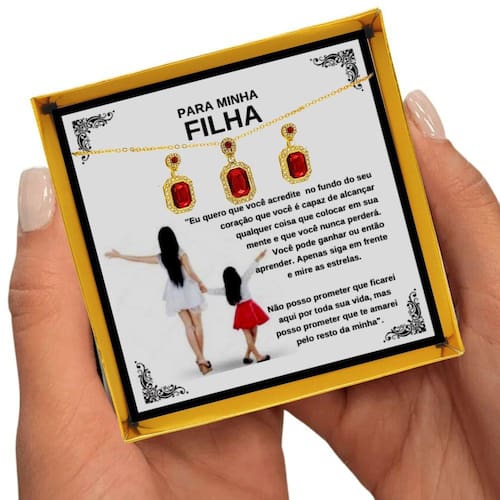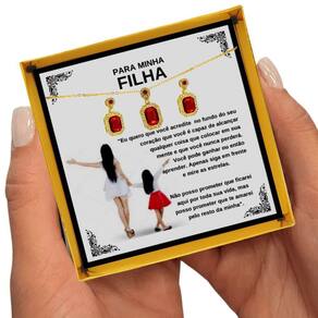 Colar Presente Aniversário Filha Conjunto Retângulo Vermelho + Brincos + Pingente + Anel + Caixinha Dedicatória - Cor: Dourado / Adicional: Conjunto Retângulo