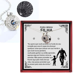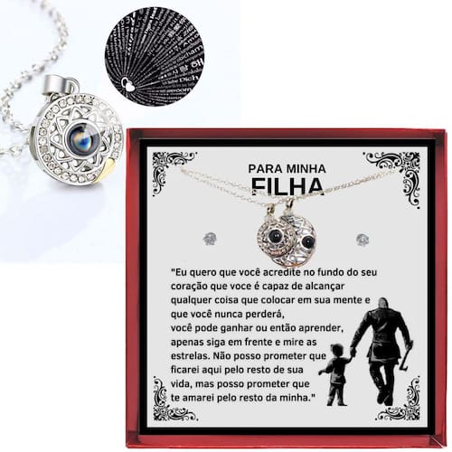 Trata-se de lindo conjunto composto por colar, pingente, par de brincos e anel + caixinha quadrada com dedicatória.