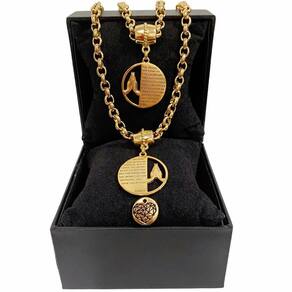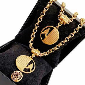 - O tamanho padrão da corrente é 45cm e da pulseira 20cm, mas elas têm um fecho que permite abrir a corrente para ajustar o tamanho ao seu gosto ou para retirar o pingente;