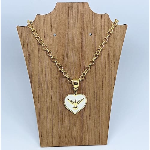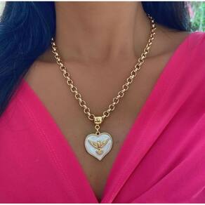 Colar Corrente Pingente Coração Divino Espírito Santo Descubra o esplendor do Colar Corrente Pingente Coração Divino, uma peça que une fé e estilo de forma sofisticada. Com um elegante pingente do Espírito Santo em resina perolada, este colar é perfeito para expressar sua espiritualidade com charme e glamour. Características do Produto: - Corrente Elos Português: 45 cm + 5 cm de extensor, com 6 mm de largura, proporcionando um ajuste perfeito. - Pingente: 2,5 cm de circunferência, confeccionado em Madrepérola de 3 mm, que traz uma beleza única e delicada. - Fecho Lagosta: Para maior segurança ao usar.