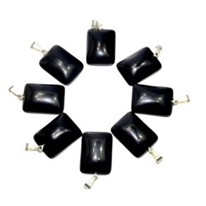 Pingente Retangular Liso Pedra Obsidiana Negra em Prateado com pino e perinha para cordão, mineral de garimpo pedra com lapidação e montagem manual estilo artesanal.