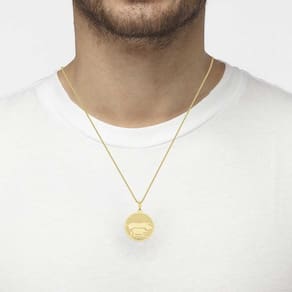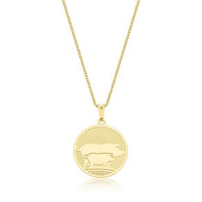 A VL traz o Colar Suinocultura Revestido em Ouro, com uma medalha texturizada e os desenhos do porco e leitão. Modelo unissex.
