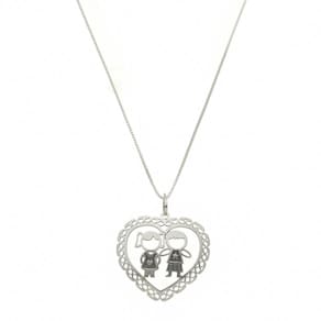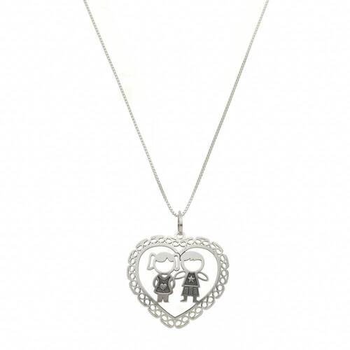 O colar possui um coração vazado com Casal de Filhos no centro em prata, combinação perfeita com a corrente veneziana. É uma joia que pode ser usada em diversas ocasiões, desde eventos formais até o dia a dia.