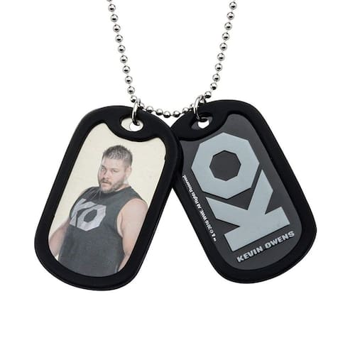 Vamos nos preparar para a briga! Use seu amor pela WWE com esta variedade de joias modernas e estilosas! Essas etiquetas duplas apresentam uma imagem de Kevin Owens, bem como seu logotipo da WWE! As etiquetas para cães vêm com um colar de corrente de 24 polegadas de comprimento. Mercadoria oficialmente licenciada pela WWE.