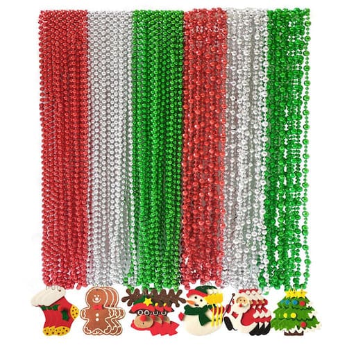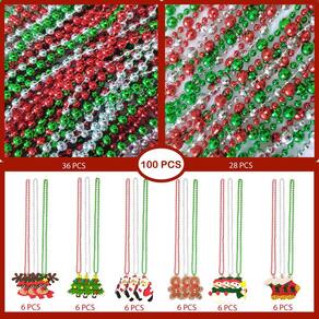 - [Quantidade abundante]: o pacote inclui 36 colares metálicos de miçangas vermelhas, prateadas e verdes, 28 unidades de colares vermelhos, verdes e prateados, 6 peças com enfeite de árvore de natal, 6 peças com enfeite de Papai Noel, 6 peças com enfeite de veado, 6 peças com enfeite de boneco de neve e 6 peças com enfeite de meia de natal, colar suficiente é para uma festa usar.