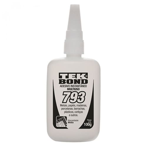 Colas Adesiva Instantânea Tek Bond 793 100g Aplicação: Adere diversos tipos de materiais, como compostos de borracha, EPDM, borracha nitrílica, neoprene, EVA e Viton. É um adesivo multiuso, muito utilizado no setor moveleiro, setor industrial principalmente em artesanato de chinelos, caixas de MDF e muito mais. Características: É um produto monocomponente e não requer mistura. O processo de cura inicia-se quando uma fina camada de adesivo é aplicada entre as superfícies entrando em contato com a umidade do ar atmosférico. Modo de Uso: Para obter um resultado satisfatório, as superfícies devem estar limpas, isentas de óleo e sujeira. Deve-se aplicar uma camada fina de adesivo em apenas 1 um dos substratos a serem colados, pois o excesso prejudica o bom desempenho da colagem. Após a aplicação do adesivo, é preciso manter as peças pressionadas por aproximadamente 20 segundos, quando a cura inicial estará concluída e a peça poderá ser manuseada com segurança. A cura total ocorrerá em 24 horas. Este adesivo é indicado para folgas de até 0,10mm. Precauções: O excesso de cola prejudica a colagem. Cola a pele e olhos em poucos segundos. Mantenha fora do alcance das crianças. Dados Técnicos: Viscosidade cP : 80 a 120 Média Temperatura de Trabalho ºC : -55 a 80 Preenchimento de Folgas mm : Até 0,10 Resistência ao Cisalhamento Aço x Aço : ? 100Kgf/cm2 Ean: 7898472250176