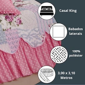Colcha Casal King Belize Kit 6 Peças com Babados Elegante Variação: Patchwork Rosa Olá, seja bem-vindo a à Atual Ecommerce Se você busca transformar o seu quarto em um ambiente sofisticado e acolhedor, vai se encantar com o Kit 6 Peças Cobre Leito Colcha Casal King Belize com Babados. Sabemos como é frustrante ter uma cama sem vida ou enxovais que não valorizam o ambiente. Pensando nisso, trouxemos uma solução completa: beleza, conforto e praticidade em um só produto. Por que escolher o Kit Belize Clientes relatam que o quarto ganhou um novo ar de elegância e aconchego. Muitos destacam a praticidade na lavagem e conservação, sem perder o charme. Outros elogiam o fato de ser um kit completo, que dispensa a compra de peças separadas. Especificações Técnicas: 01 Cobre leito: 3,00 m x 3,10 m 02 Porta-travesseiros: 70 cm x 50 cm 02 Capas de almofada: 40 cm x 40 cm 01 Almofada decorativa com enchimento Composição: Superior: Microfibra estampada 100% poliéster Manta: 100% poliéster Inferior: 100% polipropileno Tecido matelassado com babado, ideal para cama King Size. : 3 meses contra defeitos de fabricação - mais segurança e confiança na sua compra. Obrigado pela visita à Atual Ecommerce. Marca: Não Informado