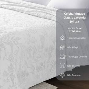 Descubra o prazer de vestir sua cama com a elegância e qualidade da coleção Vintage Classic da Jolitex. Com a tecnologia Chenille e uma paleta de cores sofisticada em bege, branco, cinza, marrom, verde e azul, cada peça traz um toque refinado para a sua decoração. Desenvolvida para ser prática e duradoura, não amassa, não encolhe e mantém sua beleza impecável, mesmo após muitas lavagens.