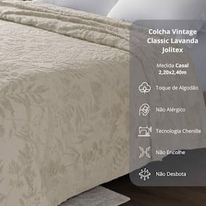 Descubra o prazer de vestir sua cama com a elegância e qualidade da coleção Vintage Classic da Jolitex. Com a tecnologia Chenille e uma paleta de cores sofisticada em bege, branco, cinza, marrom, verde e azul, cada peça traz um toque refinado para a sua decoração. Desenvolvida para ser prática e duradoura, não amassa, não encolhe e mantém sua beleza impecável, mesmo após muitas lavagens.