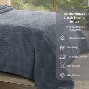 Descubra o prazer de vestir sua cama com a elegância e qualidade da coleção Vintage Classic da Jolitex. Com a tecnologia Chenille e uma paleta de cores sofisticada em bege, branco, cinza, marrom, verde e azul, cada peça traz um toque refinado para a sua decoração. Desenvolvida para ser prática e duradoura, não amassa, não encolhe e mantém sua beleza impecável, mesmo após muitas lavagens.