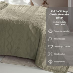 Descubra o prazer de vestir sua cama com a elegância e qualidade da coleção Vintage Classic da Jolitex. Com a tecnologia Chenille e uma paleta de cores sofisticada em bege, branco, cinza, marrom, verde e azul, cada peça traz um toque refinado para a sua decoração. Desenvolvida para ser prática e duradoura, não amassa, não encolhe e mantém sua beleza impecável, mesmo após muitas lavagens.