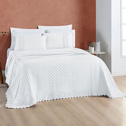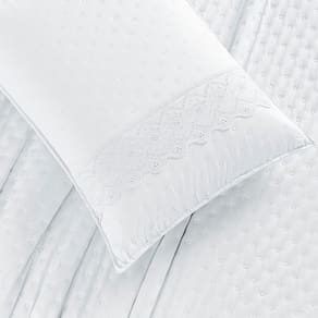 Matelassê em bolinhas: Confere um toque de sofisticação e elegância ao conjunto. 2 Porta tarvesseiros 70cm x 50cm com detelha em bordado ingles Acabamento em bordado ingles: Detalhe delicado que adiciona um toque romântico. Tecido macio: Proporciona toque suave e agradável. Fácil de cuidar: Lavável em máquina, conforme as instruções da etiqueta.
