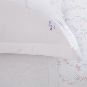 O Kit Cobre-Leito Colcha Buddemeyer Percalle Verbena Dupla Face 100% Algodão Fio Penteado 180 Fios é um convite ao aconchego com charme natural. Sua estampa floral aquarelada traz um cenário delicado de folhas e flores silvestres, em tons suaves como lavanda, verde-claro e amarelo pálido, sobre um fundo branco sereno. O toque romântico se completa com pequenos elementos em tom lilás e detalhes como borboletas discretas, que fazem deste kit uma peça encantadora para transformar o quarto num refúgio calmo e leve.