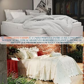 Imagine chegar em casa depois de um dia longo e se envolver em uma colcha que abraça você com suavidade e elegância. A Yasmin não é só uma colcha, é o aconchego que seu quarto merece, a sensação de relaxamento e bem-estar que transforma o sono e o descanso em momentos inesquecíveis. Além disso, o tecido 100% algodão egípcio é natural, respirável e perfeito para quem tem pele sensível.