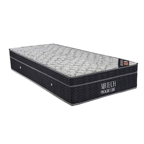 Colchão Airtech Progressive Solteiro (78x188x29) - Estrutura em molas Nanolastic, EPS, D26 Pró - Airtech SOBRE O PRODUTONovo Colchão Airtech Progressive possui em sua estrura o avançado molejo Nanolastic que tem a menor molécula de carbono do mercado, proporcionando um perfeito suporte para a coluna e conforto para qualquer biótipo, possui Ortopillow e em sua camada de conforto espuma D26 Pró Aditivada de Alta Performance, bordado em matelassê e placa EPS. Seu tampo é em malha de alta qualidade e lateral em Camurça, apresentando um toque refinado ao colchão. Possui a tecnologia No Turn, que dispensa a necessidade de virar o colchão. O Airtech Progressive recebe tratamento antialérgico e antiácaro, ajudando a reduzir os problemas respiratórios. Um excelente colchão para suas noites.CARACTERÍSTICASEstrutura composta pelo avançado molejo Nanolastic, placa EPS, Ortopillow, tampo em malha, bordado em Matelassê, manta de espuma D26 Pró, faixa lateral em Camurça, No Turn (não precisa virar), tratamento antialérgico e antiácaro.