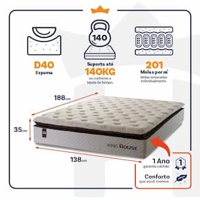 Feito com os mais nobres materiais em sua composição, ele conta com espuma D40 e molas ensacadas. Por ser mais macio, o colchão de molas ensacadas individualmente traz benefícios e ajuda no alinhamento da coluna. O colchão King Size House acomoda melhor o contorno do corpo, dispondo de forma correta quadris e ombros, expulsando as dores e problemas de coluna.