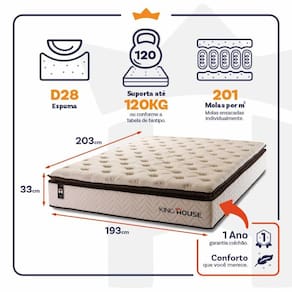 Feito com os mais nobres materiais em sua composição, ele conta com espuma D28 e molas ensacadas. Por ser mais macio, o colchão de molas ensacadas individualmente traz benefícios e ajuda no alinhamento da coluna. O colchão King Size House acomoda melhor o contorno do corpo, dispondo de forma correta quadris e ombros, expulsando as dores e problemas de coluna.