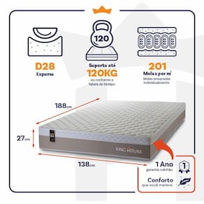 Feito com os mais nobres materiais em sua composição, ele conta com espuma D28. O colchão King House acomoda melhor o contorno do corpo, dispondo de forma correta quadris e ombros, expulsando as dores e problemas de coluna.