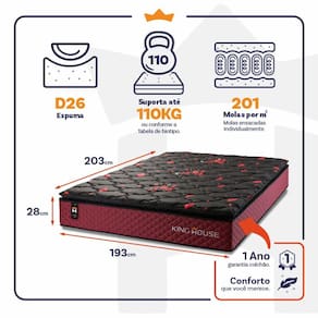 Feito com os mais nobres materiais em sua composição, ele conta com espuma D26 e molas ensacadas. Por ser mais macio, o colchão de molas ensacadas individualmente traz benefícios e ajuda no alinhamento da coluna. O colchão King Size House acomoda melhor o contorno do corpo, dispondo de forma correta quadris e ombros, expulsando as dores e problemas de coluna.
