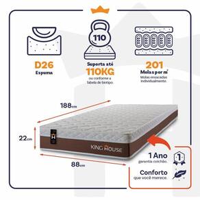 Feito com os mais nobres materiais em sua composição, ele conta com espuma D26. O colchão King House acomoda melhor o contorno do corpo, dispondo de forma correta quadris e ombros, expulsando as dores e problemas de coluna.