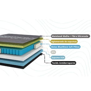Características: Estrutura Matelassê malha Fibra Siliconada Molas ensacadas Soft pillow EPS Espuma D20 Tecido antiderrapante One side Suporta peso até 120kg
