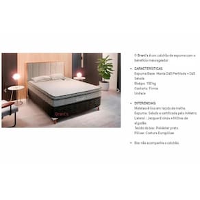 COLCHÃO (BENEFÍCIOS) Tipo de Colchão - c/ Massagem Vantagens Extras de Colchão - Vibromassageador c/ Controle - c/ Controle Remoto Tipo de Pillow - Pillow Top Europeu Tecido com Tratamento - AntiÁcaro e AntiFungo Tipo Tecido de Forração Revestimento - Malha de Alta Qualidade Tipo de Forração do Revestimento Inferior - Antiderrapante Tipo de Tecido de Revestimento da Faixa Lateral - Jacquard Cor do Tecido de Revestimento da Faixa Lateral - Clara Cor do Tecido do Tampo - Claro Modo de Utilização - One Side