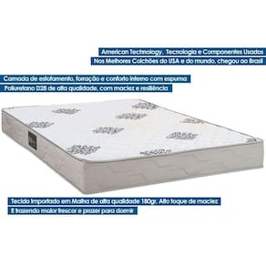 Tipo de Colchão - Anatômico Vantagens Extras de Colchão - Ecologicamente Correto - Tecnologia Americana Tecido com Tratamento do Colchão - AntiÁcaro e AntiFungo Bordado do Revestimento do Colchão - Contínuo Forração Revestimento do Colchão - Malha de Alta Qualidade Tecido de Revestimento da Faixa Lateral do Colchão - Suede Modo de Utilização do Colchão - Double Side
