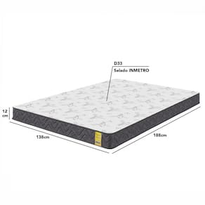 Características: Espuma D33 Tecido lateral 100 Poliéster Grafite Tampo 100 Poliéster Branco com detalhes Grafite Acabamento Bordado É dupla face Nível de Conforto Firme Possui Tratamentos Antiácaro, antifungo, antibactéria, antimofo Possui Certificado Inmetro Suporte de peso 110 kg Garantia 1 ano