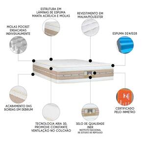 O Colchão de Molas traz uma estrutura interna que conta com molas ensacadas individualmente e bordas em espuma de alta resistência, revestidas em feltro para garantir estabilidade. O enchimento interno inclui lâminas de espumas D28, proporcionando um suporte confortável e balanceado. O tecido das laterais é 100% poliéster com bordado zig-zag, enquanto a faixa lateral com aria 3D promove ventilação constante para o colchão. No tampão superior, a malha de poliéster conta com uma camada de espuma D24 hiper macia, e seu acabamento em debrum reforça a durabilidade e elegância do produto. Já com pillow top dupla face e tecido em poliéster.