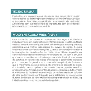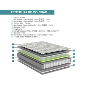 Colchão com 23cm de altura desenvolvido no sistema de molas ensacadas individualmente, molas individuais, que o descanso de uma pessoa não interfere em outra, com excelente custo benefício em sua fabricação. ; Sistema No Flip, que não precisa virar o colchão, apenas girar. Acabamento em debrum de 35 mm para maior resistência. O tecido estampado contém tratamento antialérgico, antimofo e antiácaro. Colchão confortável indicado para biótipo de até 120 ;kg individual. A borda perimetral aumenta a área de descanso, além do tecido inferior ser antiderrapante para evitar que o colchão deslize sobre o somiê. ;