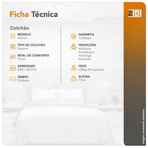 O Colchão Atlanta possui espuma D28/AG70 produzida com um ótimo padrão de qualidade, passando por diversos controles de qualidade proporcionando assim o Atlanta uma excelente opção para nossos clientes em relação ao custo-benefício deste produto.
