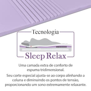 O Colchão Sleep Relax possui uma inovadora camada de espuma tridimensional com densidade D28 desenvolvida para te deixar mais relax! Seu corte especial ajusta-se ao corpo alinhando a coluna e diminuindo os pontos de tensão, te levando a um sono extremamente relaxante. Além disso, possui molas ensacadas individualmente que não transfere o movimento de um lado a outro do colchão, fazendo com que você se vire menos a noite e tenha mais individualidade.