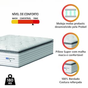 REVESTIMENTO SUPERIOR: Pillow macio, tecido em malha branca que permite melhor ventilação, possui pillow super que é uma camada extra de conforto.