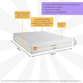 Tecido: Malha Poliéster/Viscose/Jacquard Acabamento: Debrum Com Pillow: Sim Tipo de Pillow: Europillow Duplo Pillow: Não Conforto: Firme Peso Suportado: 260kg (130kg em cada lado) Hipoalergênico: Não Antiácaros: Não Eco-friendly: Sim Sistema: Turn-free (não é necessário virar o colchão, apenas girá-lo a cada 15 dias). Selo INMETRO: 09977-001-01/2023 Fabricante: Inducol