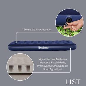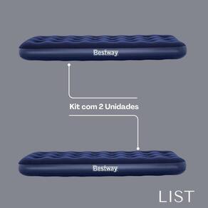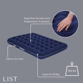 - Composição: 59,3% PVC, 39,8% fibra viscosa + PVC, 0,9% outros materiais, garantindo durabilidade e resistência. - Medidas Inflado: Largura: 1,52 m Comprimento: 2,03 m Altura: 22 cm - espaço ideal para um casal em cada colchão. - Capacidade de Carga: Suporta até 300 kg 661 lbs por colchão, perfeito para diversas ocasiões. - Superfície Flocada: Acabamento aveludado para maior conforto e sensação de maciez. - Inferior em Vinil: Resistente e durável, ideal para uso em diferentes superfícies. - Vigas Internas: Proporcionam estabilidade e suporte durante o uso. - Câmara de Ar Adaptável: Ajuste facilmente a firmeza do colchão conforme sua preferência. - Incluso: 2 colchões e 2 adesivos de reparo para pequenos consertos.