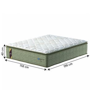 REVESTIMENTO SUPERIOR: Pillow top, tecido em malha branca com detalhes em bege que permite melhor ventilação, possui pillow super que é uma camada extra de conforto.