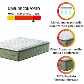 REVESTIMENTO INTERIOR: Molejo estrutural em molas prolastic, que permitem que o colchão suporte até 180kg por pessoa, oferecendo conforto e estabilidade durante o sono.